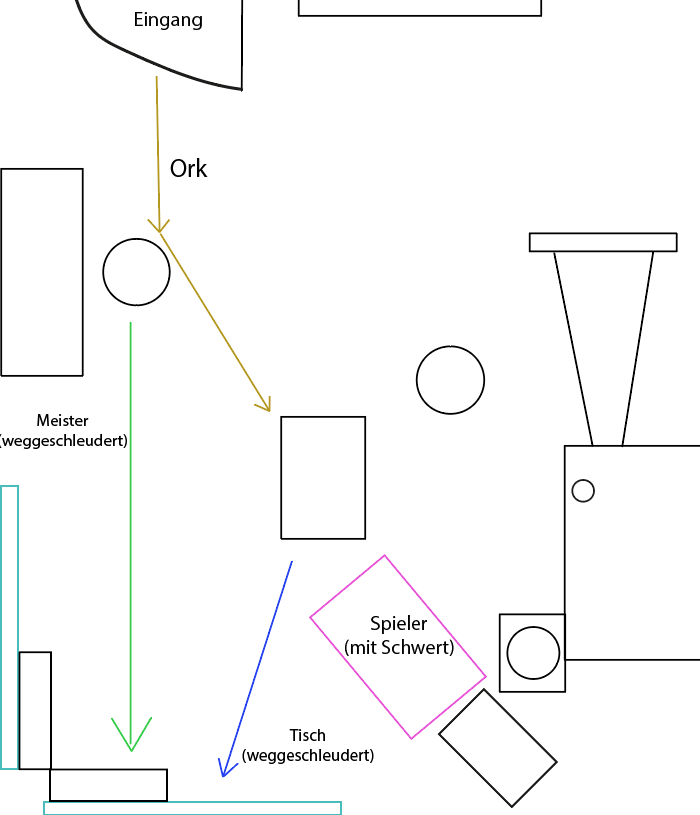 Sobald der Ork eintrifft, werden der Schmiedemeister und der Tisch nacheinander an die Wand geschleudert. Ersterer für den dramatischen Effekt, zweiterer für den dramatischen Effekt und um zu bewerkstelligen, dass der Spieler über genug Freiraum verfügt, um den Ork, welcher wütend schnaubend vor ihm/ihr steht, mit einigen Schwerthieben zu bekämpfen. Der Tisch müsste hierbei außerhalb der Anwendung im passenden Moment weggezogen werden. Da nur die Objekte, welche mit den Händen in Berührung kommen, mit Trackern versehen sind, sollte dies problemlos möglich sein (es werden Filzuntersetzer empfohlen).