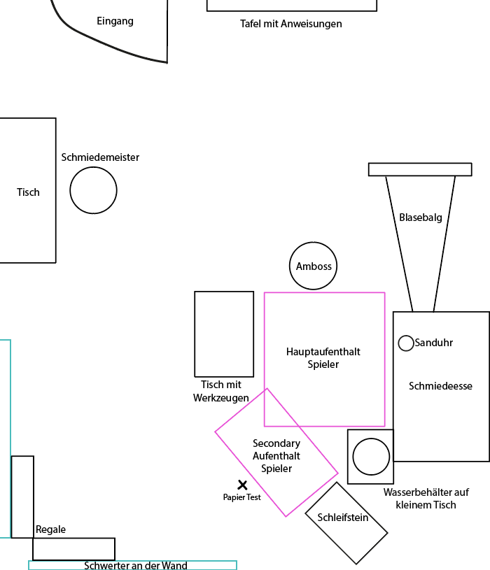Beim Layout wurde darauf geachtet, dass der Spieler sich möglichst wenig im Raum bewegen muss, sodass es möglichst nicht zu Motion Sickness kommt. Erst zum Schluss muss sich der Spieler über wenige Schritte minimal bewegen, um vom Hauptaufenthaltsraum zum sekundären Aufenthaltgebiet zu gelangen. Dies geschieht ab dem Moment, in dem das Schwert geschliffen wird. Insgesamt wurde zudem auch darauf geachtet, dass die Spielumgebung zwar möglichst nah an der Realität ist, aber doch nicht zur Reizüberflutung führt. So wurden beispielsweise bewusst keine Fenster eingebaut, welche die Aufmerksamkeit auf das Geschehen außerhalb des Schmiederaumes lenken könnten. Abgesehen davon wurden die Objekte so angeordnet, dass es genug Ablagemöglichkeiten auf der passenden Höhe gibt, auf welchen der Spieler bei Bedarf die Dinge in seinen Händen ablegen kann und sich zudem auch nicht wirklich bücken muss.