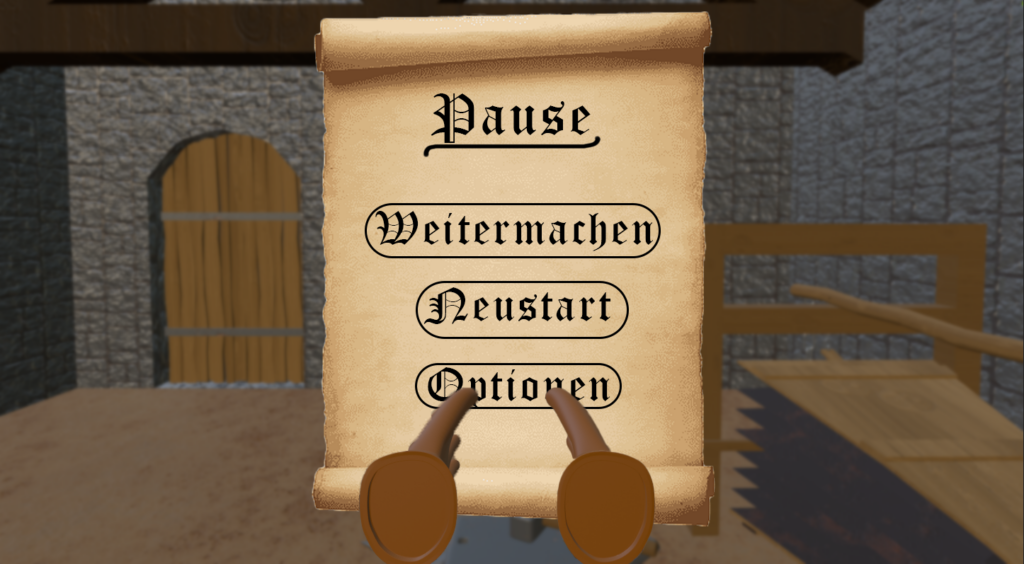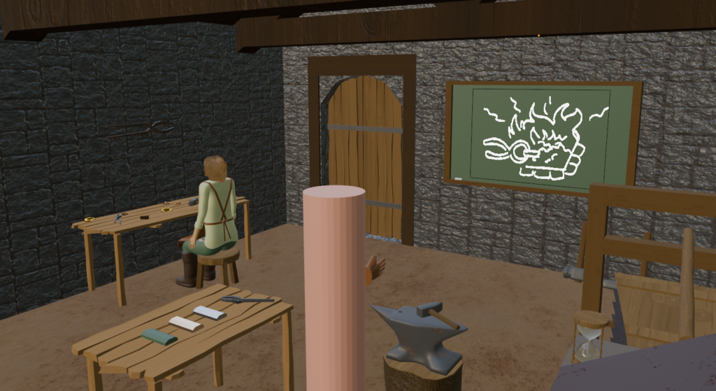 Bei der Entwicklung dieser Umgebung wurde der Hauptfokus auf die User Experience gelegt, während der sekundäre Fokus hochwertige Assets als Ziel hatte. Neben den später aufgeführten Gedankengängen beim Layout und den Bewegungsabläufen, wurde zur Unterstützung der User Experience zudem die Barrierefreiheit für verschiedene Personengruppen bedacht. So ist es in den Optionen etwa möglich, die Schriftart auf eine seriefenlose Schrift zu ändern oder Anpassungen für Personen mit einer Farbsehschwäche vorzunehmen. Des Weiteren wurde das Lederband an der Kurbel des Schleifsteins blau gefärbt, um es von der Umgebung abzuheben und zur Interaktion anzuregen. Bei dieser und auch bei allen anderen Interaktionen gilt: Sollte der Spieler einmal nicht weiter wissen, so kann er entweder einen Blick auf die große Tafel vor ihm werfen, auf welcher über einfache und verständliche Symbolbilder die aktuell anstehende Handlung erklärt wird, oder aber Blickkontakt mit dem Schmiedemeister aufnehmen, welcher den nächsten Schritt erklärt.